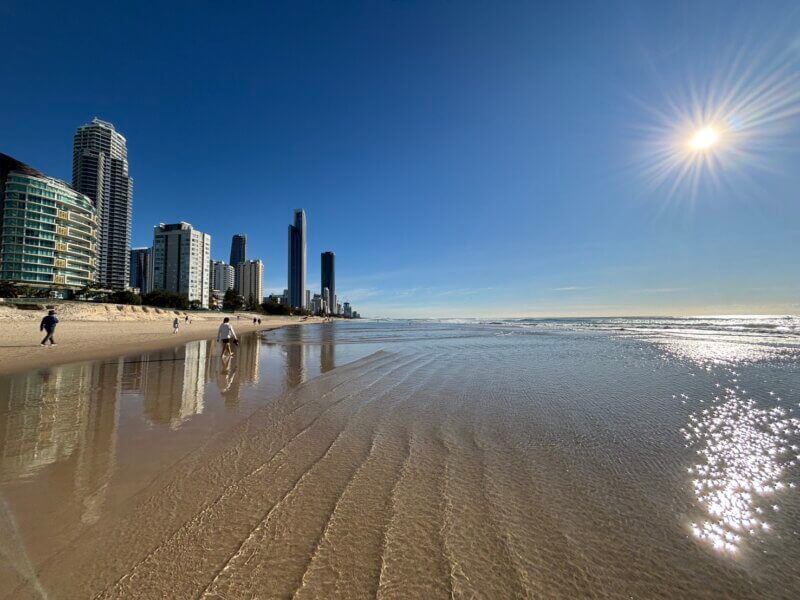 朝はサーファーズパラダイスの静かなビーチを散策。波の音と潮風を感じながら、自然のリズムと一体になれる心地よい時間。
