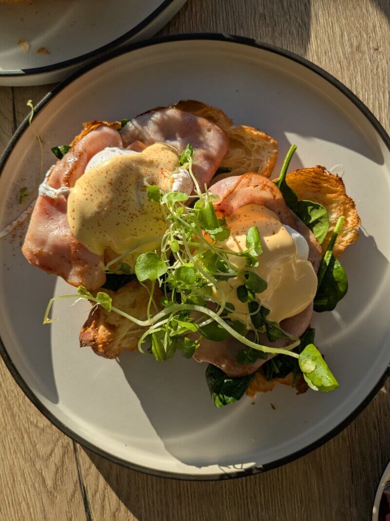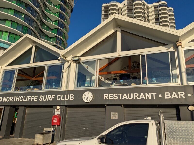 Q1リゾート&スパから徒歩圏内のノースクリフ・サーフ・クラブで朝食。ここはサーファーズ・パラダイスにある人気ビーチクラブのひとつ。レストランを併設し、オープンエアのデッキ席など海を眺めながら食事が楽しめる。カフェやバー、ゲーミングルームもあり、朝食からナイトライフまで1日中利用できる。レストランで人気があるのはチキン・パルミジャーナ、シーフード、ピザ、パスタなど。チキンの胸肉を使ったブラッドナム・バーガーが名物メニュー。