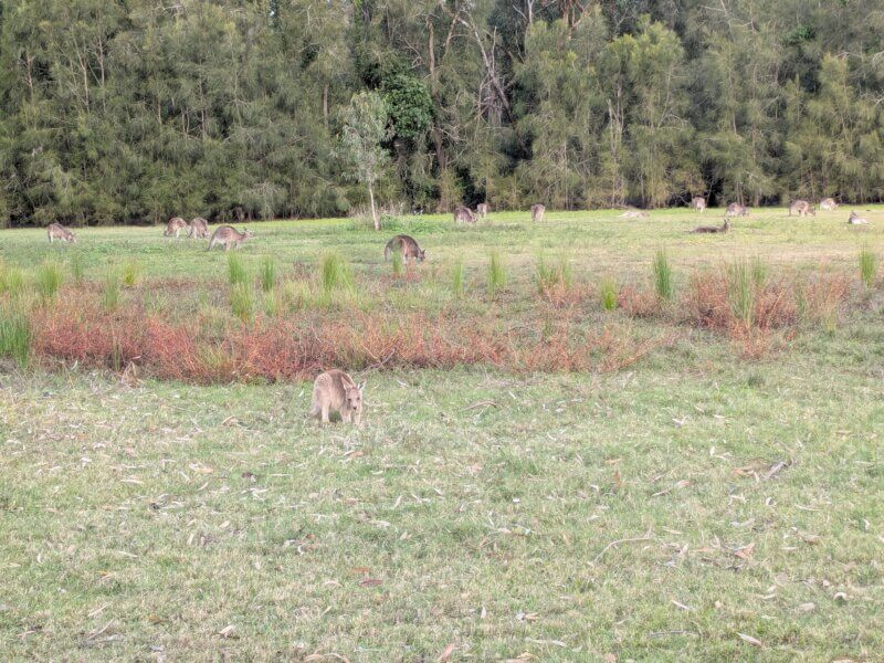 午後はレンタカーで内陸へ。Coombabah Lakelands Conservation Areaに立ち寄り、草原で野生カンガルーの群れを遠目に観察。自然の中でジャンプする姿は圧巻で、息をのむ美しさでした。