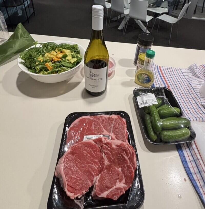 Q1のキッチンで豪快に焼いたオージービーフと彩り野菜のサラダで夕食。海を見下ろすリビングでのディナーは、旅の疲れを癒してくれる最高の時間。ワインとともに、初日からゆったりとスタート。
